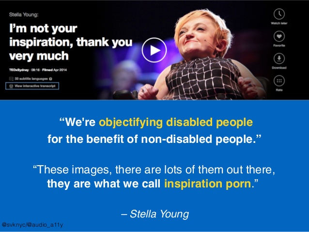 First of all, just in case you don’t know what disability or inspiration porn is, here’s the person who is known for coining it: Stella Young. ‘I’m not your inspiration, thank you very much.’